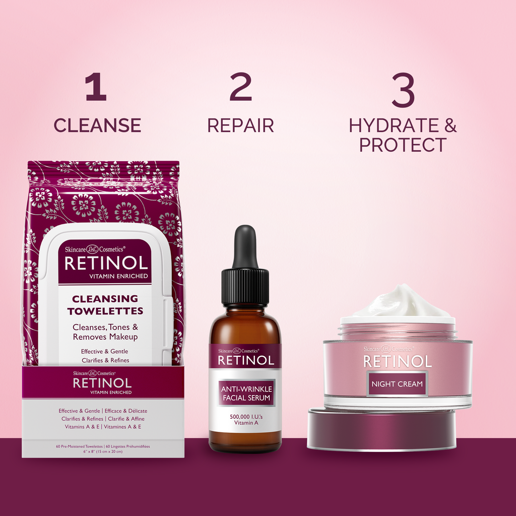 Retinol (Vitamin A) exfoliates and smoothes lines & wrinkles, brightens skin tone, improves firmness & elasticity.